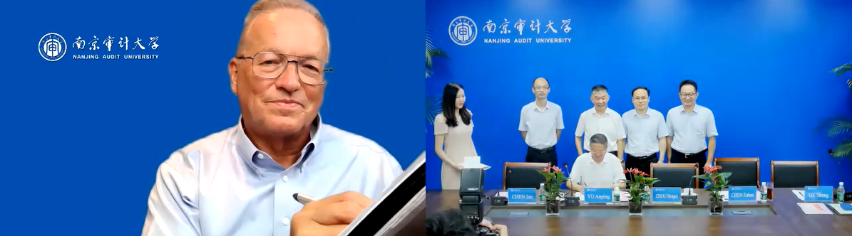 隨后,俞安平與理查德·錢伯斯通過視頻形式同步簽署南京審計大學海外榮譽院長聘用協議。
