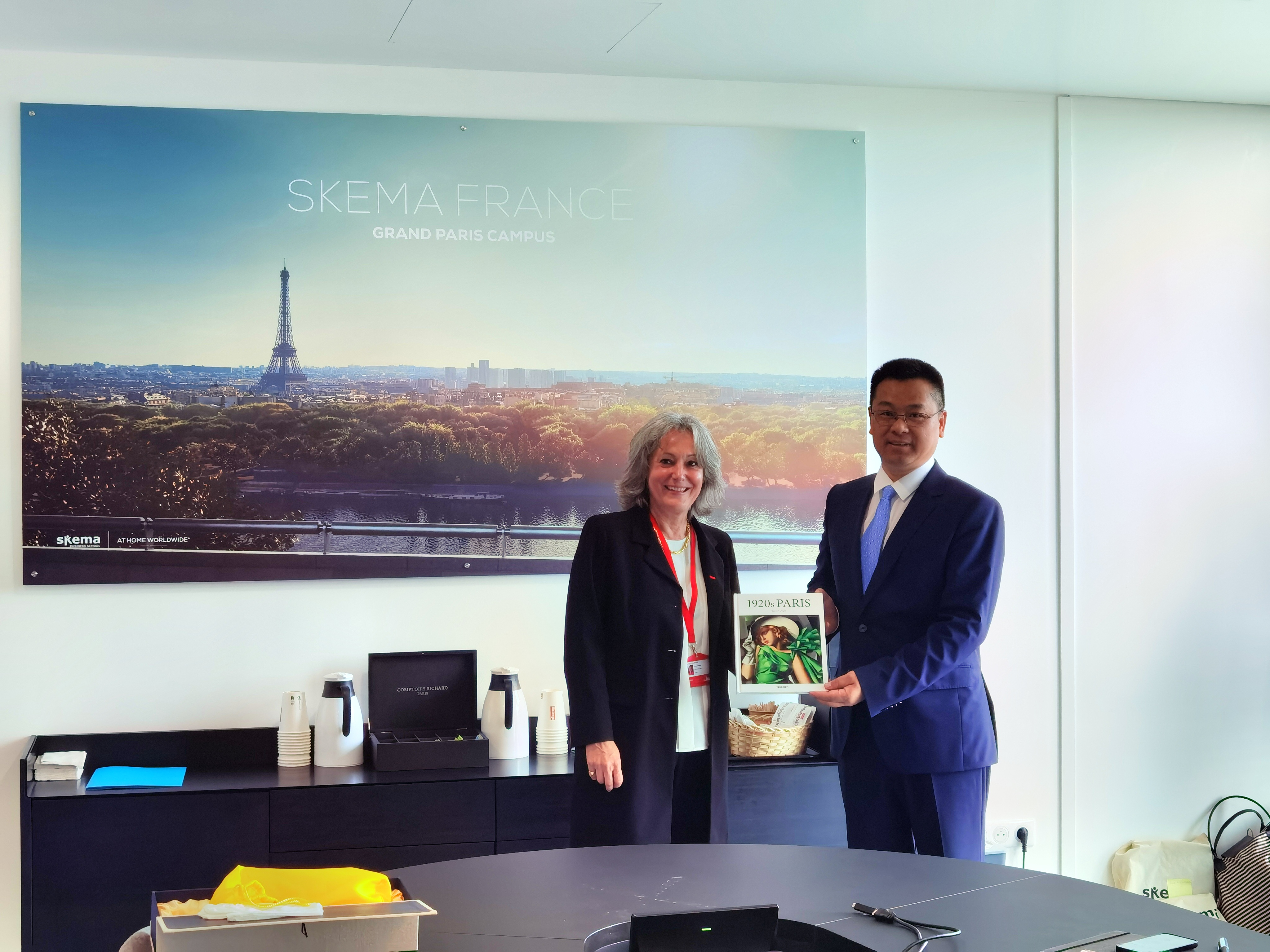 陸華良回顧了兩校在創新辦學模式、優化人才培養方案及學生培養等方面取得的成果,特別是去年在碩士辦學、DBA項目等方面達成的合作意向。他指出,本次訪問旨在深入探討碩博項目簽約、師生互派、科研合作、國際組織人才培養及海外實習基地共建等事宜。他表示,中法兩國友誼源遠流長,希望兩校精誠合作,為推動中法高等教育交流與合作作出更多貢獻。